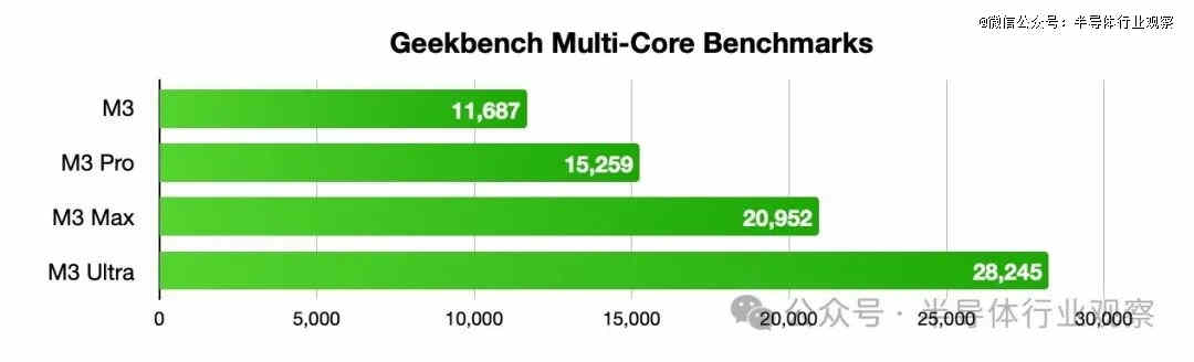与往常一样,M3 Ultra 是由两块 M3 Max 芯片拼合而成。这意味着 CPU 核心数量为 28 或 32 个,其中性能核心为 20 或 24 个,并搭配 8 个能效核心。它还包含一个 32 核神经引擎,以及 60 或 80 核 GPU。内存容量跃升至 512GB 统一内存,并提供 800GB/s 的内存带宽。说到性能图表,主要要看的是多核性能。与 M2 和 M3 代不同,你可以看到 M3 Pro 和 M3 Max 芯片之间存在相当大的差距。